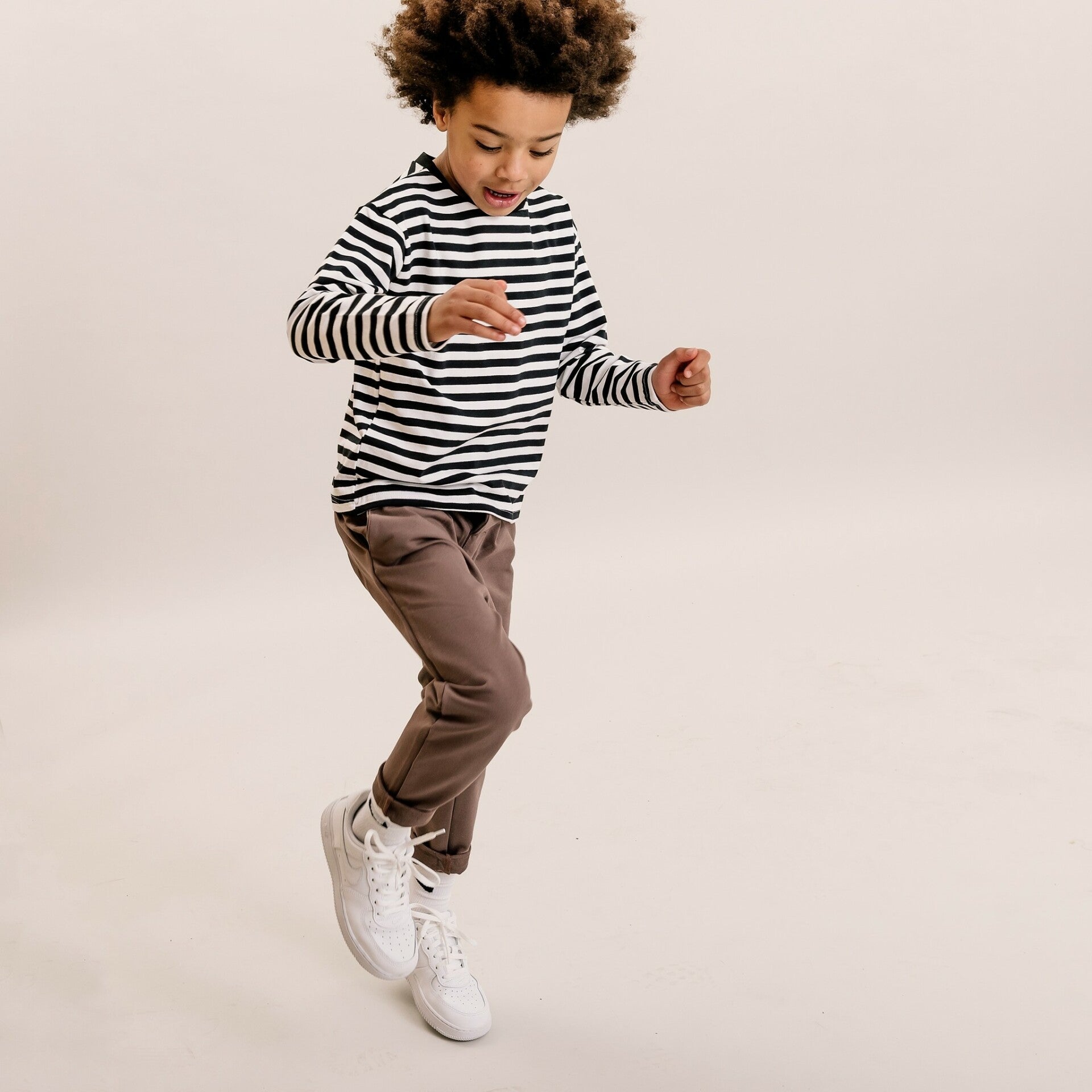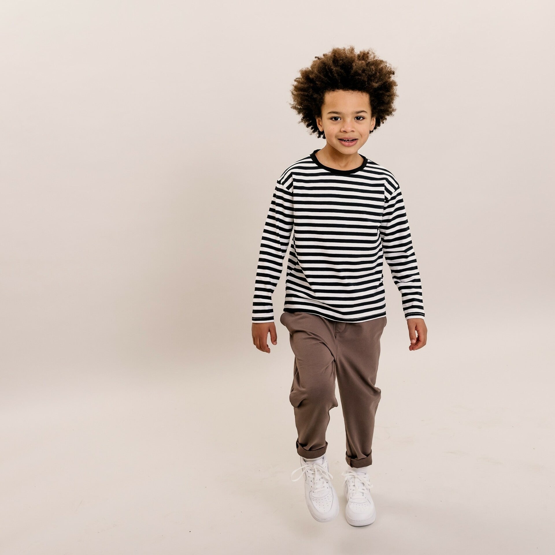 De gestreepte longsleeve van no labels, is de perfecte basic. De brede streep geeft een toffe uitstraling aan de look.