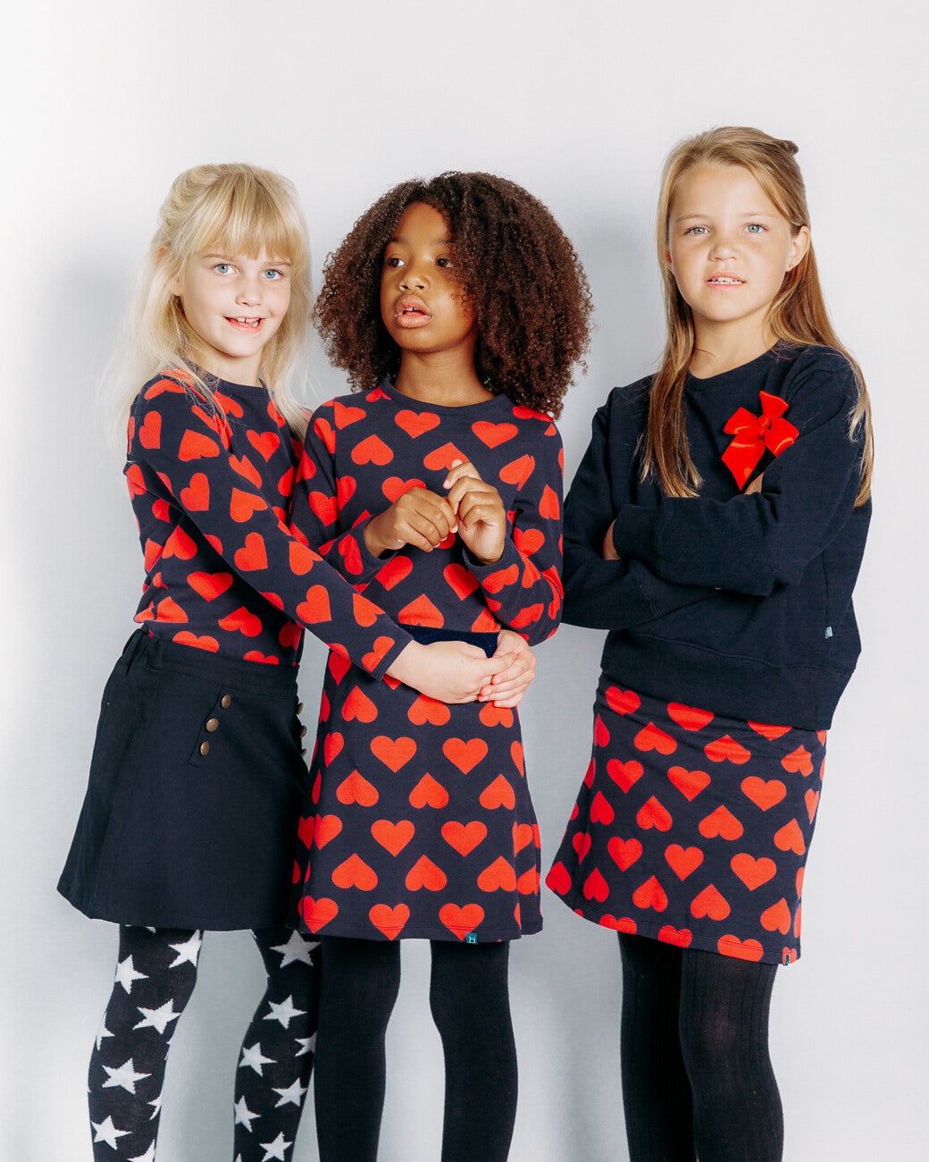 Dit wijd uitlopende rokje van Bobbi Ravioli in navy met rode all-over harten print en glitter tailleband is een absolute eye-catcher. Dit vrolijke rokje is zowel casual als chique te dragen. Het rokje is geproduceerd in Portugal en gemaakt van 95% biologisch katoen en 5% elastaan. Door het elastaan sluit de rok perfect aan. Vanwege de carbonic finishing zit deze rok heerlijk comfortabel en voelt het super zacht aan.