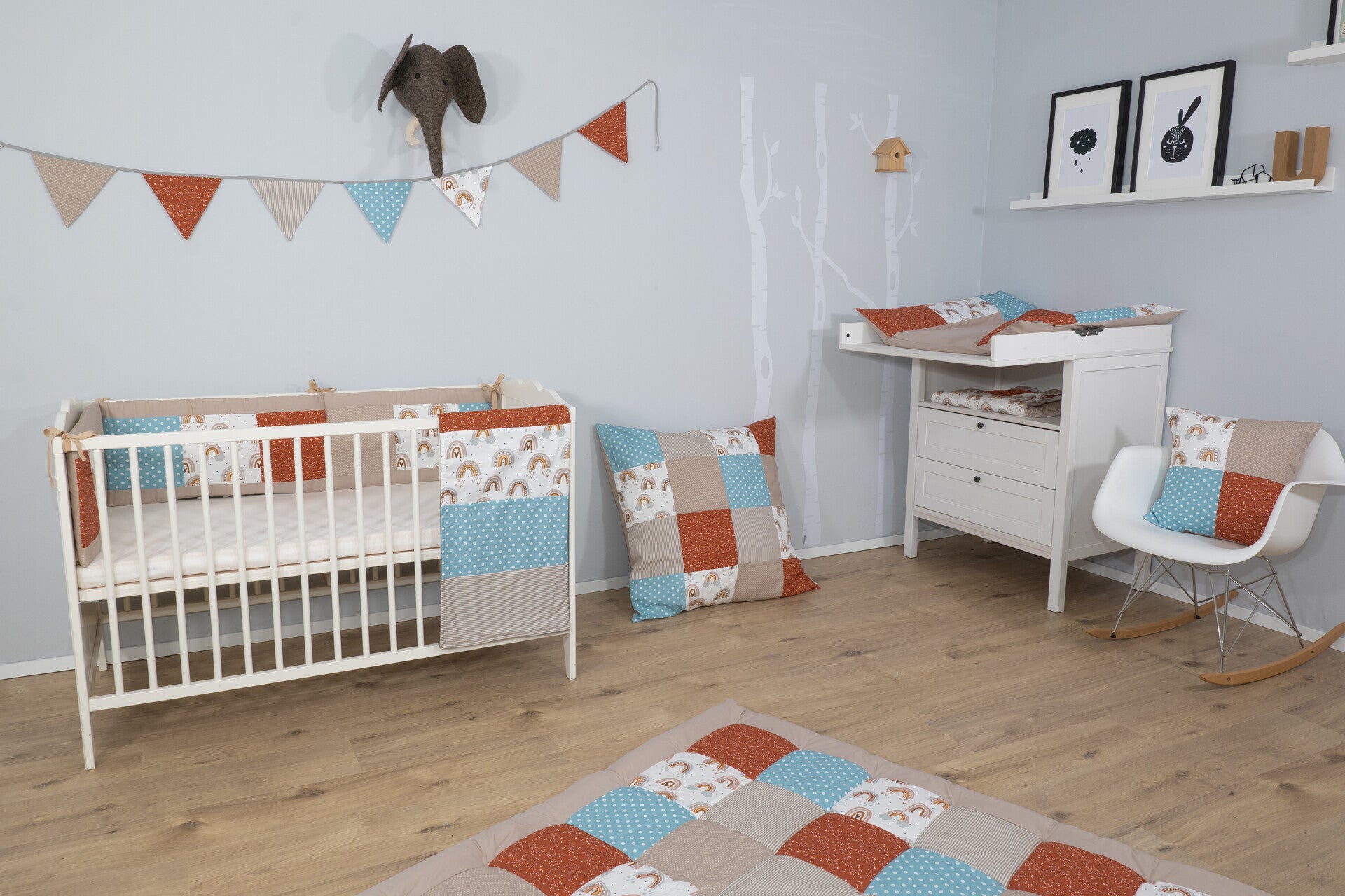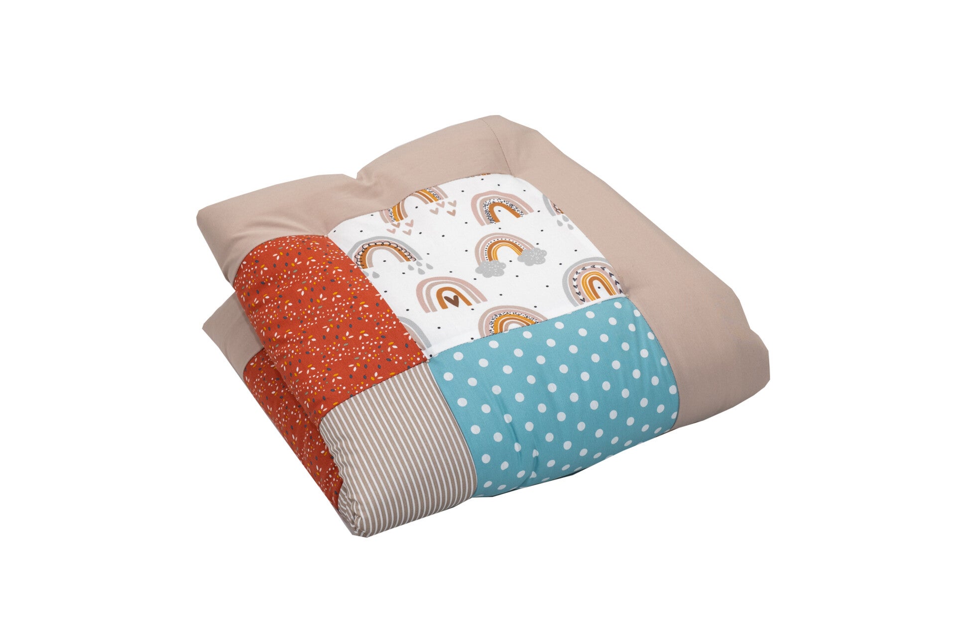 Dit patchwork boxkleed is zo leuk voor de kleintjes, ze kunnen erop kruipen en spelen. Het warmte-isolerende volumefleece beschermt tegen koude vloeren.