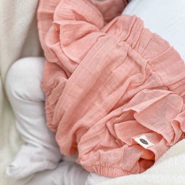 Het mooie weer kan komen! Dankzij het speciaal geweven, GOTS-gecertificeerde biologische katoen is onze schattige volantbroek niet alleen een absolute blikvanger, maar ook super ademend, waardoor ze perfect zijn warmere dagen.