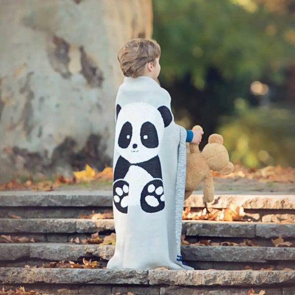 Mooie ademende babydeken gemaakt van 100% biologisch katoen, een puur natuurlijk product. De deken met panda is grof en fijn dubbel gebreid en heeft een gevlekte achterkant.