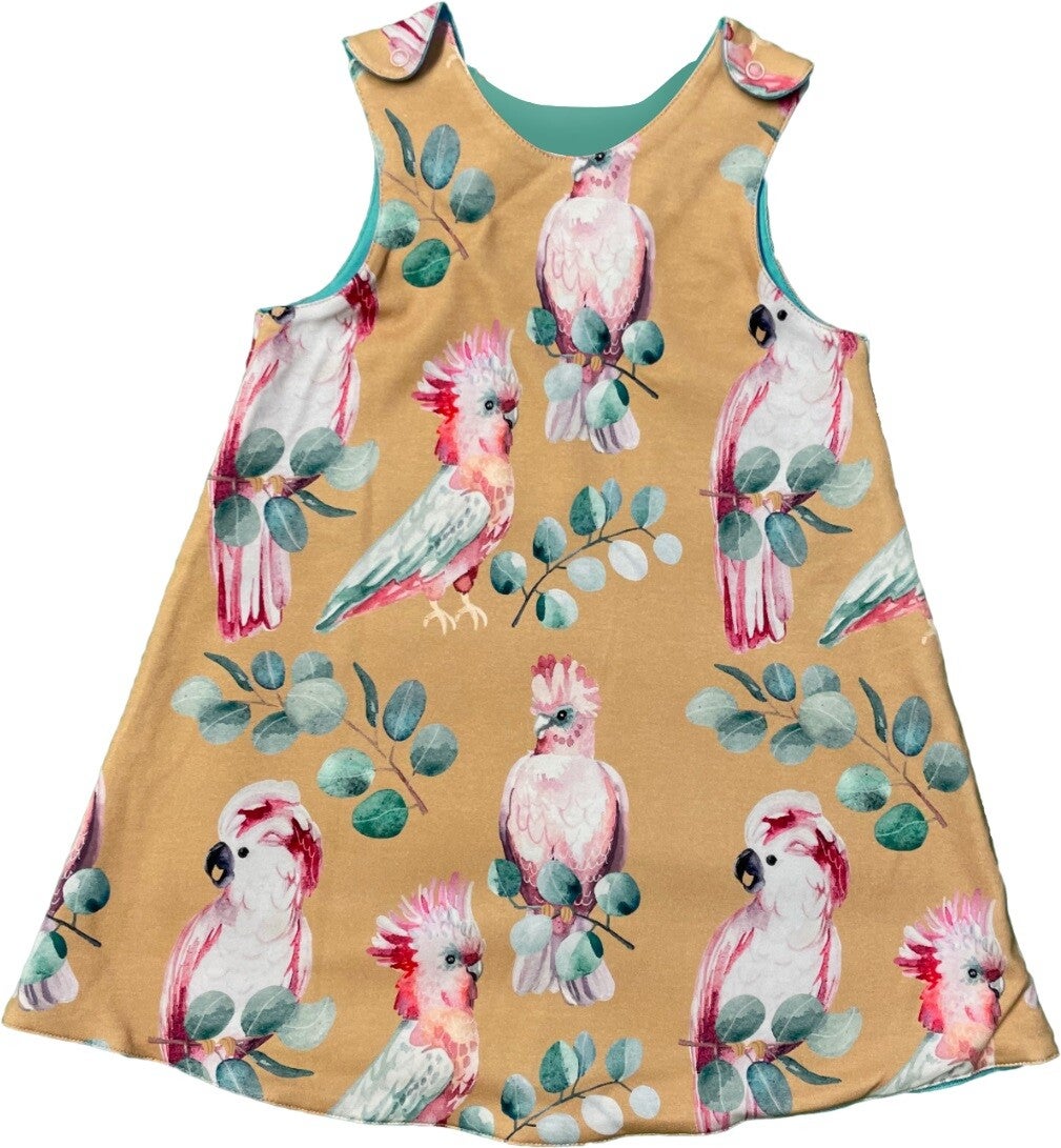 Omkeerbaar jurkje van biologisch katoen met kaketoes.